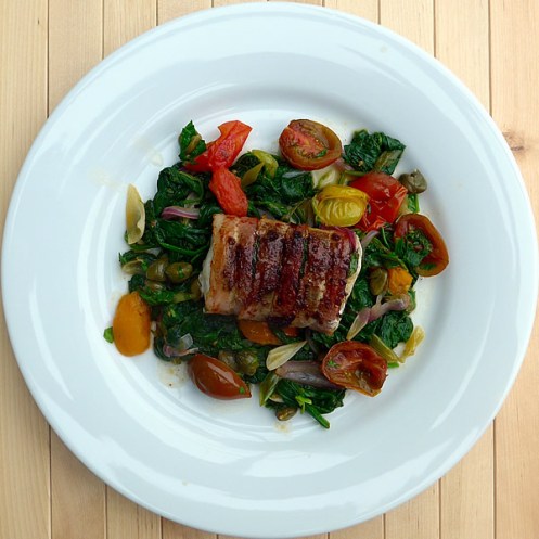 Kabeljau im Speckmantel vom Grill – mit kurzgebratenem Spinat, Tomaten und Frühlingszwiebeln » KabeljauSpeckmantel