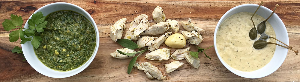 Tonno di Pollo – eingelegtes, verzupftes Pouletbrüstli mit Bagnet verd und Salsa tonnata » Bagnet verd
