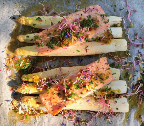 Weisser Spargel mit Lachs und Orangenbutter im Ofen gebacken