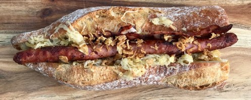 Baquette in der Mitte teilen, längs Butterflyartig aufschneiden und aufklappen. Die Schnittflächen in der Grillpfanne kurz anrösten. Mit Feigensenf bestreichen und mit dem warmen Sauerkraut belegen. Gebratene Salsicce und Speck darauflegen und mit Röstzwiebeln bestreuen. Brothälften zusammenklappen und geniessen.