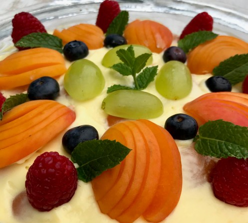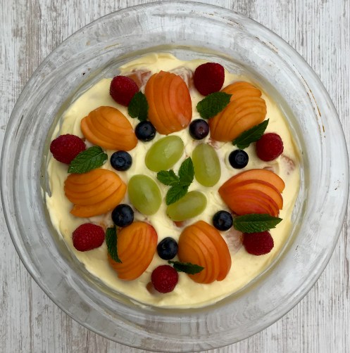 Die Vanillecreme gemäss den Angaben auf der Packung zubereiten. Die Aprikosen halbieren oder vierteln. Danach mit dem Zucker, Honig und etwas Wasser zu einem Kompott kochen und ebenfalls abkühlen lassen. Den Rahm halbsteif schlagen und mit einem Schwingbesen unter die Vanillecreme geben. Die Hälfte der Löffelbiscuits in eine Schüssel schichten, mit dem Aprikosensaft beträufeln. Die Hälfte des Kompotts und die Hälfte der Crème darübergeben. Den Vorgang nochmals wiederholen und die Götterspeise zwei bis drei Stunden im Kühlschrank ziehen lassen. Mit frische Früchten, Beeren und Pfefferminzblätter garnieren.