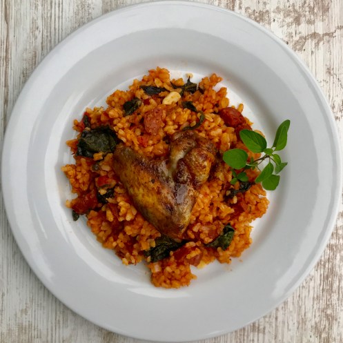 Den Reis zugeben und 1 Minuten unter Rühren andünsten. Tomatensauce und die Bouillon einrühren und aufkochen lassen. und alles 10 Minute kochen. Die Hitze auf niedrige Stufe reduzieren und 15 Minuten, ohne umzurühren garen lassen. Dann die Hitze auf mittlere Stufe erhöhen, den Spinat und die Oreganoblättchen zugeben und weitere 5 Minuten mitgaren.