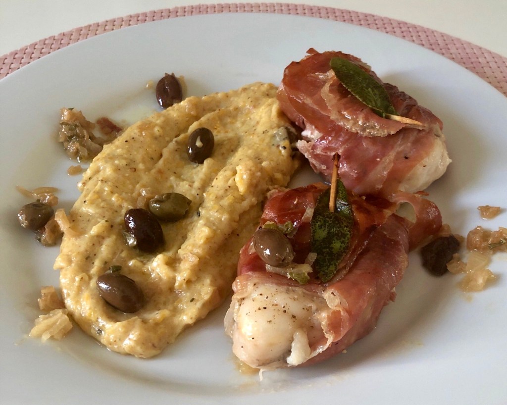 Seeteufel-Saltimbocca, Polenta, Pecorino, Oliven