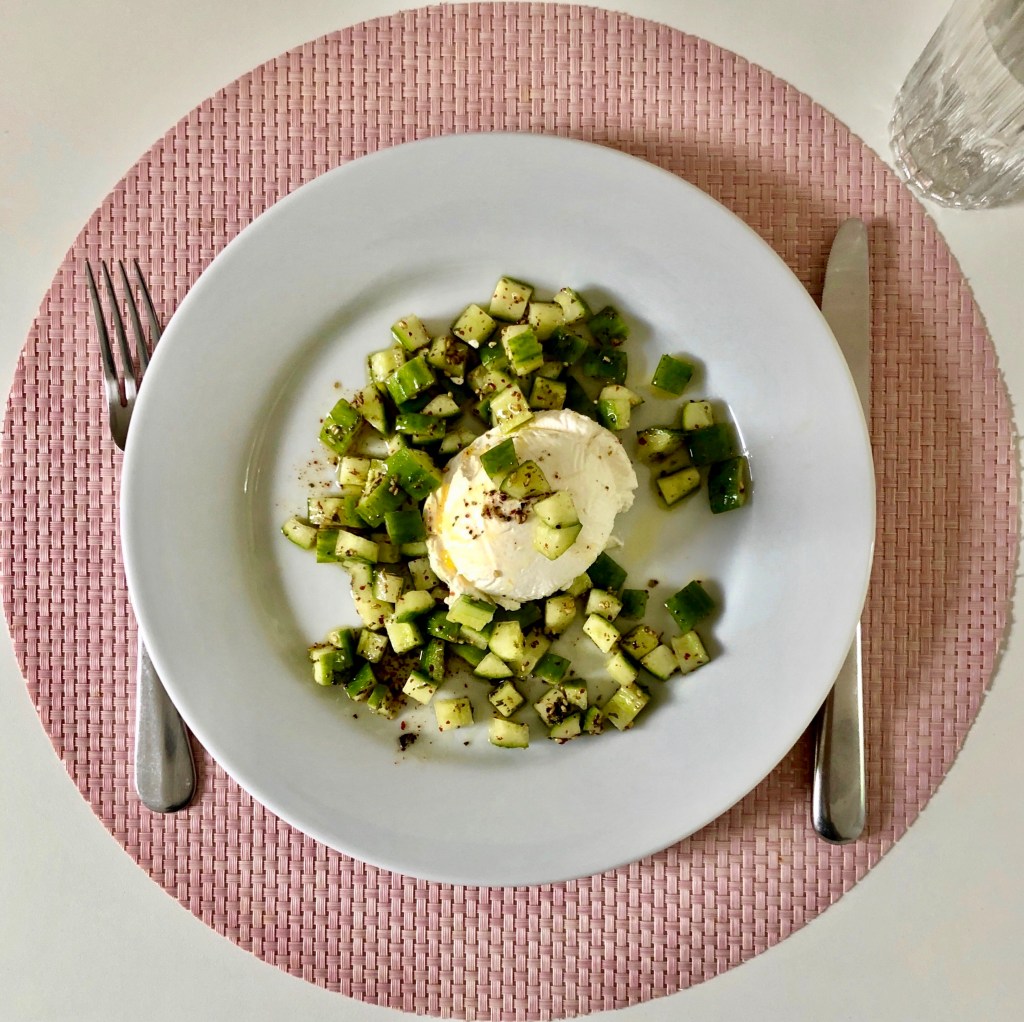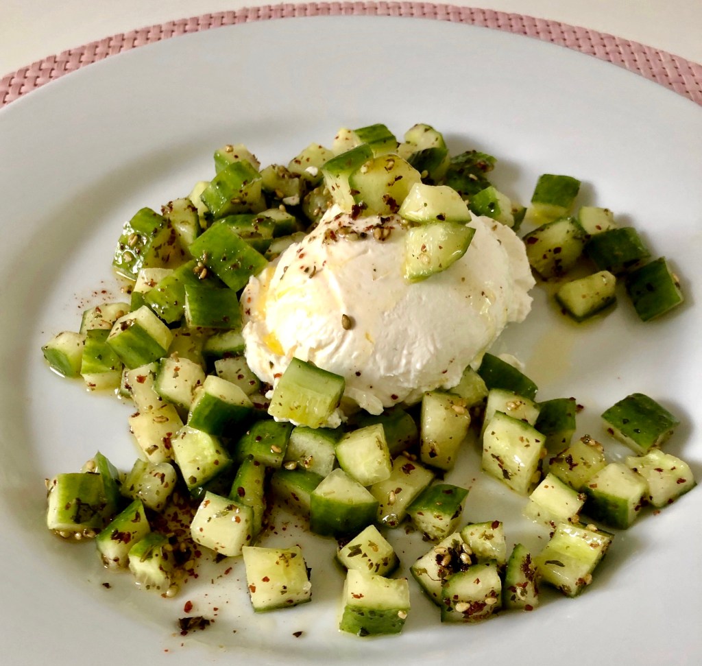 Anstelle von Labneh passt auch Burrata bestens zu dieser Gurkensalsa.