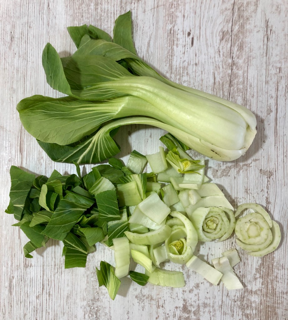 Die rote und die weisse Zwiebel halbieren und in hauchdünne Scheiben schneiden. Wenig rote Zwiebelscheiben für die Deko beiseite stellen. Die Knoblauchzehen fein hacken. Die Frühlingszwiebeln mit dem schönen Grün in feine Ringe schneiden.