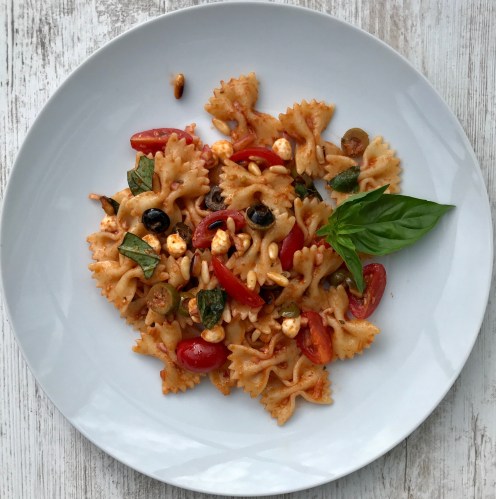 Die Pasta nach Packungsanweisung in reichlich Salzwasser al dente kochen. Tomaten, Oliven und Zwiebeln in einer Schüssel mit der Sauce vermischen. Die Mozzarella Kugeln, die gerösteten Pinienkerne und die verzupften Basilikumblätter hinzugeben. Sobald die Orecchiette al dente sind, diese abgiessen und vorher noch 2 EL Pastawasser der Sauce hinzugeben. Die Pasta leicht unter fliessendem kaltem Wasser abschrecken und unter die Sauce mischen.