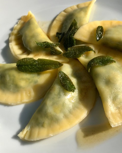 Mezzelune mit Sardellen, Spinat, Ricotta und Salbeibutter